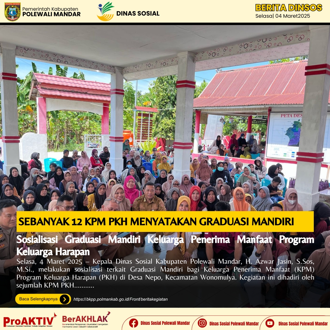 Sebanyak 12 KPM PKH menyatakan Graduasi mandiri pada Sosialisasi Graduasi Mandiri Keluarga Penerima Manfaat Program Keluarga Harapan di Desa Nepo Kecamatan WonomulyaSelasa, 4 Maret 2025 – Kepala Din...